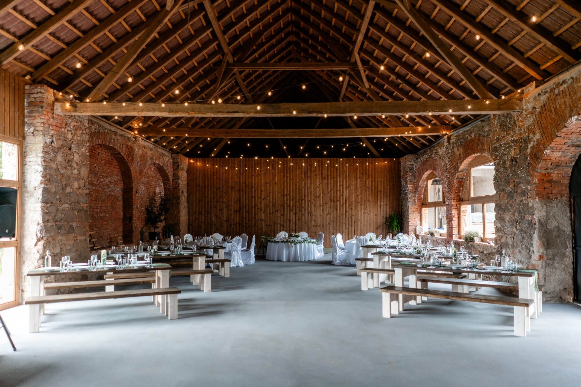 Vzdušný a světlý prostor s nezaměnitelným rustikálním kouzlem, který pohodlně usadí 80 až 100 hostů. Dominantou interiéru je stylový bar, který se stává centrem večerní zábavy. Mysleli jsme i na veškerý komfort – součástí stodoly je moderní sociální zázemí a zázemí pro catering, které ocení dodavatelé jídla.